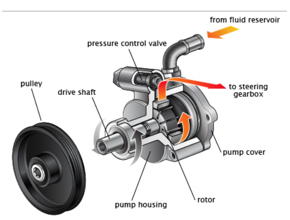 Most power steering systems work by using a belt driven pump to provide hydraulic pressure to the system. This hydraulic pressure is generated by a rotary-vane pump which is driven by the vehicle's engine. As the speed of the engine increases, the pressure in the hydraulic fluid also increases, hence a relief valve is incorporated into the system to allow excess pressure to be bled away.